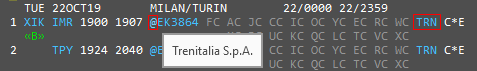 Par exemple, ce segment ferroviaire de Turin à Milan est répertorié comme un segment Emirates (EK) avec un partage de code Trenitalia :