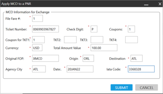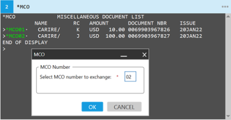 ARC uniquement. Si un PNR contient les données MCO stockées, les agents sont invités à saisir le numéro MCO à utiliser lors de l’échange.