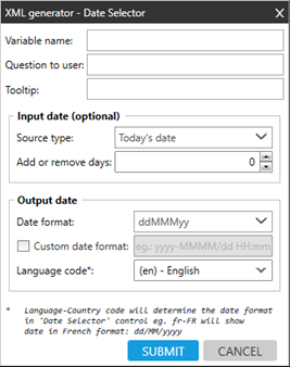 Entrez le nom de la variable entre crochets et définissez le format de la date. Par exemple, lisez la date d’un premier segment à partir d’un fichier de réservation et conservez-la sous la variable : [FirstSegmentDate] pour afficher cette date comme date par défaut dans le calendrier.