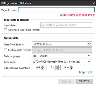 <DateTime VarName="" DateTimeFormat="" Language="" AddOrRemoveDays="" TimeZone=""></DateTime>