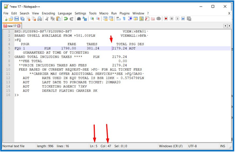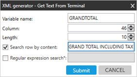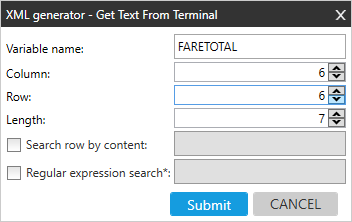 Longueur Insérez la longueur du texte du terminal que vous souhaitez que le script lise. Par exemple, entrez 7 si vous voulez lire sept caractères. Ligne de recherche par contenu Si la valeur que vous souhaitez capturer ne se trouve pas toujours dans la même ligne, vous recherchez la valeur dans une ligne qui contient une expression spécifique. Par exemple, le total général peut être dans une rangée différente en fonction du nombre de passagers ; cependant, le total général se trouve toujours dans une rangée contenant l’expression : TOTAL GÉNÉRAL TAXES COMPRISES ****).