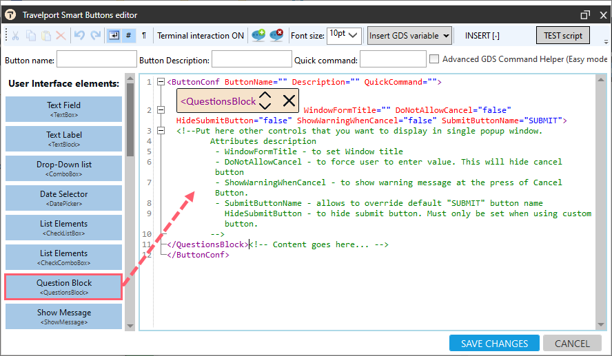 Pourboire! Si vous cliquez sur le bouton Bloc de questions <QuestionsBlock> le Concepteur de QuestionsBlocks s’ouvre.