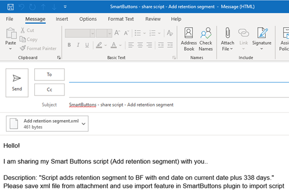 La possibilité d’exporter des Smart Buttons vous permet de partager votre bouton personnalisé avec un public plus large. Vous pouvez l’exporter vers un fichier ou l’envoyer via Microsoft Outlook.