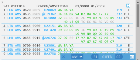 SAM 01FEB14 LONDRES/AMSTERDAM 01/0000 01/2359 1 LGW AMS 0620 0835 U28869 WA BA YA 319 E 2 LHR AMS 0635 0905 @CI9362 J4 C4 M7 V4 K7 R4 N7 L7 X7 737 C E 3 LHR AMS 0635 0905 KL1000 J2 CC DC IC ZC Y9 B9 M9 U9 K9 73J C*E H9 L5 Q5 TC EC NC RC VC GC 4 LTN AMS 0645 0900 U22151 WA BA YA 320 E 5 LHR AMS 0655 0915 BA 428 J9 C9 D9 R9 IC Y9 B9 H9 K9 M9 767 C E L9 V9 N9 Q9 O9 S9 G9 6 LHR AMS 0655 0915 @AA6726 J7 D7 R0 I7 Y7 B7 H7 K7 M7 L7 767 C*E V7 G7 S7 N7 Q7 O7 7 STN AMS 0700 0910 U23001 WA BA YA 319 E 8 SEN AMS 0730 0930 U27401 WA BA YA 319 E 9 LGW AMS 0740 0955 BA2758 J9 C9 D9 R9 I5 Y9 B9 H9 K9 M9 734 C E L9 V9 N9 Q9 O9 S9 G9 10 LHR AMS 0825 1045 BA 430 J9 C9 D9 R9 IC Y9 B9 H9 K9 M9 320 C E L9 V9 N9 Q9 O9 S9 G9 11 LHR AMS 0825 1045 @AA6502 J7 D7 R0 I7 Y7 B7 H7 K7 M7 L7 320 C*E V7 G7 S7 N7 Q7 O7 12 LHR AMS 0840 1110 KL1002 J5 C1 D1 IC Z1 Y9 B9 M9 U9 K9 73H C*E H9 L9 Q9 T9 E9 N9 R6 VC GC 13 LCY AMS 0925 1135 @AF5183 J2 CC DC IC ZC OC W9 S9 A9 Y9 AR8 C*E B9 M9 U9 K9 H9 L9 Q9 T9 E9 N9 R9 X2 GR 14 LCY AMS 0925 1135 @KL2454 J2 CC DC ZC W9 S9 A9 Y9 B9 M9 AR8 C*E U9 K9 H9 L9 Q9 T9 E9 N9 R9 G2 15 LCY AMS 1135 1350 @AF5185 J2 CC DC IC ZC OC W9 S9 A9 Y9 AR8 C*E B9 M9 U9 K9 H9 L9 Q9 T9 E9 N9 R9 X4 GR 16 LCY AMS 1135 1350 @KL2456 J2 CC DC ZC W9 S9 A9 Y9 B9 M9 AR8 C*E U9 K9 H9 L9 Q9 T9 E9 N9 R9 G4 « Plus de vols » |
