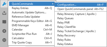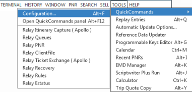 - Dans le menu Outils , sélectionnez Commandes rapides, puis cliquez sur Configuration pour afficher la boîte de dialogue Commandes rapides Travelport.