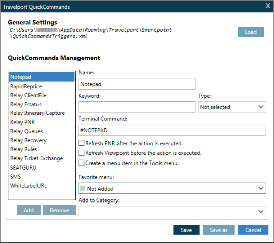- Ouvrez l’écran de configuration des commandes rapides de Travelport en procédant soit :