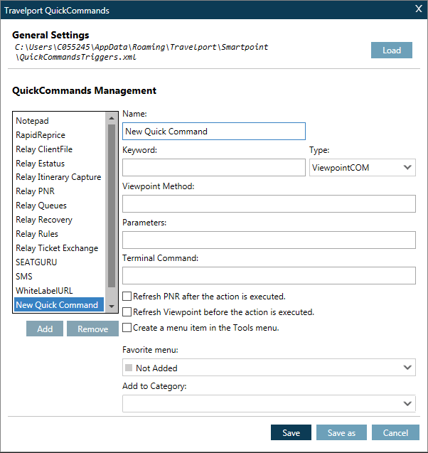 - Cliquez sur Enregistrer pour stocker la commande rapide dans la section Paramètres généraux de vos paramètres d’application (votre fichier QuickCommandsTriggers.xml par défaut).