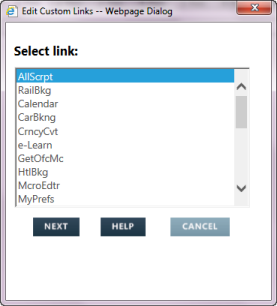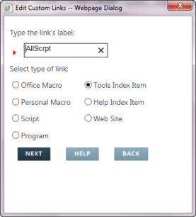 - Click NEXT to display the Edit Custom Links dialog box for your selected type of link. See Step 5 in Adding Custom Links for instructions to create each type of link.