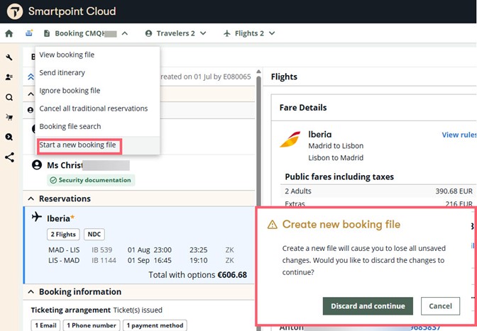 Open the Booking File menu and select Start a new booking file. A popup message is displayed to confirm the action.