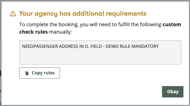If a Custom Check rule is mandatory, the booking cannot continue until the rule is fulfilled. An alert indications which information is missing. The only option is to select Okay and return to the itinerary in order to add the missing information.