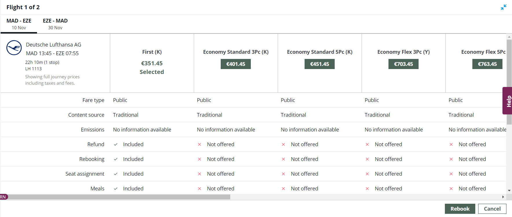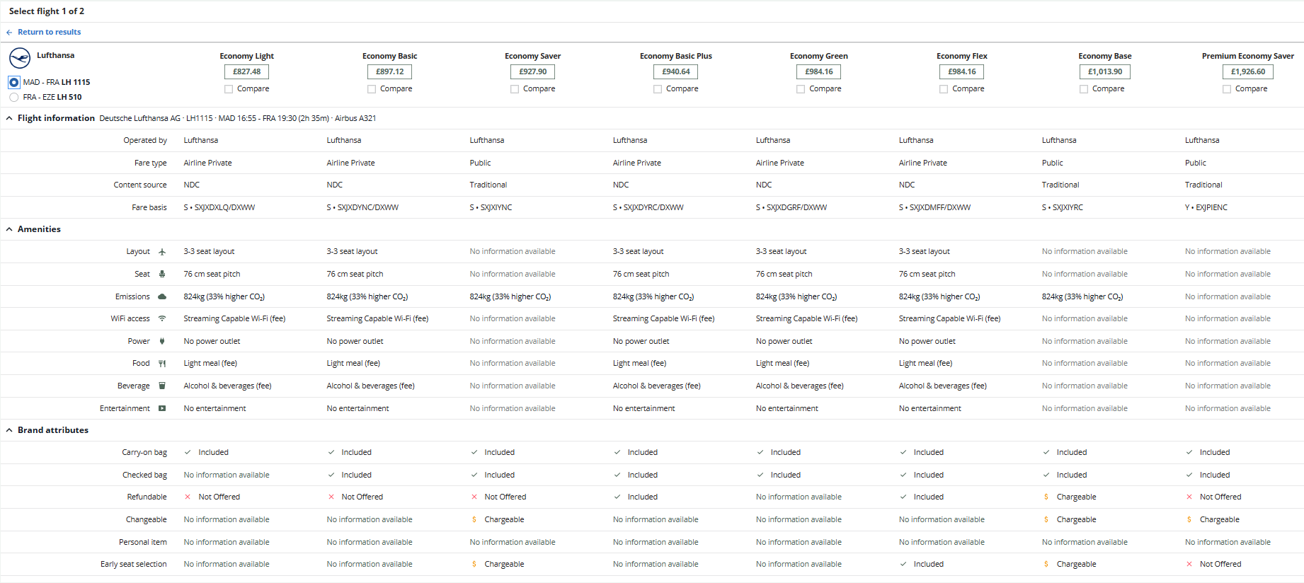 The available brands display. To select a different brand, select the price button for that brand. It is recommended to select the same brand for all flights, as mixed brands do not always combine.
