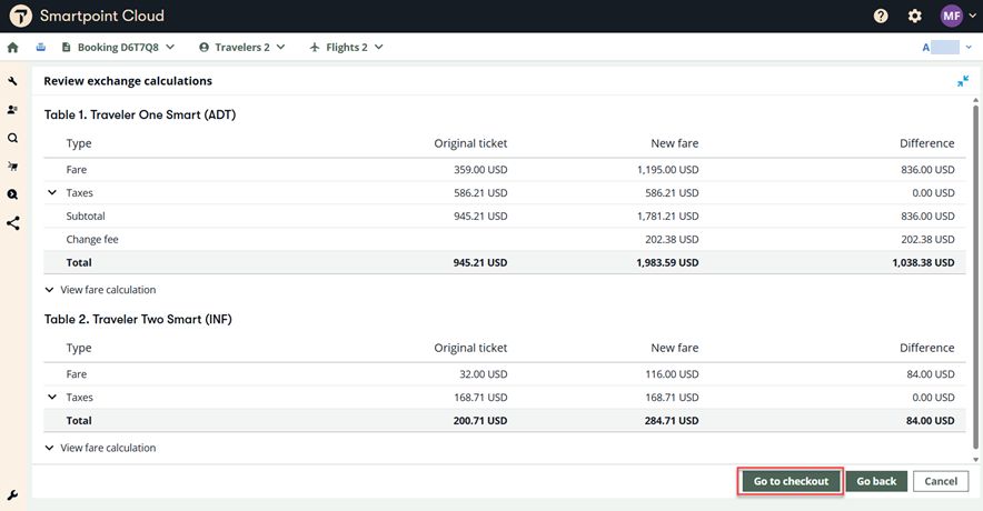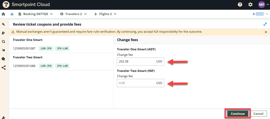 Click Continue to compare the original and new fares along with the difference. The change fee will be shown as part of the final calculation.