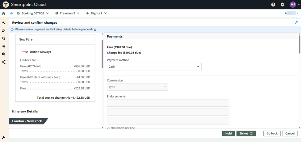 If Hold is selected, the ticket exchange will not be completed and no payment is processed. The ticketing line of the filed fare will be updated with any necessary ticketing modifiers to easily process the exchange in the future (i.e., before the ticketing deadline for the filed fare is reached), as per the details displayed/entered on the Review and confirm screen.