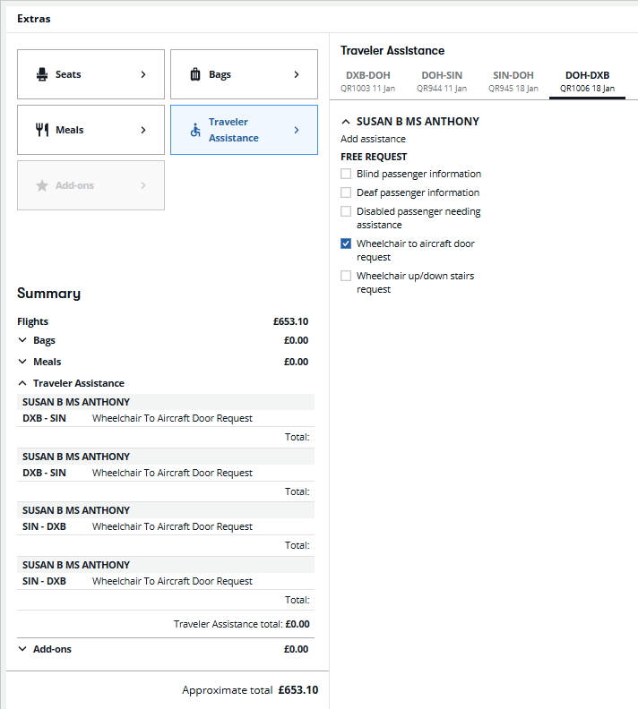 Traveler Assistance SSRs do not need to be added per segment. Any selection for a passenger applies to all segments in the NDC booking for that passenger. Multiple Special Assistance SSRs can be added and saved in a single request.