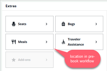 When selecting before booking, these options are located in the Extras panel . Passenger information must be included in the Booking File in order to select prior to booking.