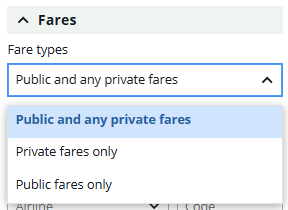 If you select private fares, select the airline from the list and enter a private fare code, if applicable.