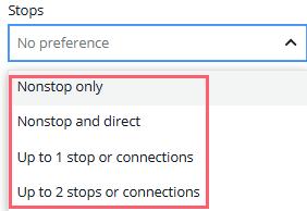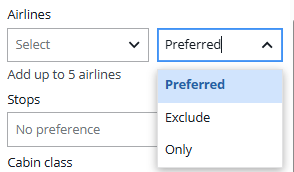 To filter results by airline, select up to 5 airlines, then choose whether these airlines are preferred, should only be returned, or should be excluded. When Preferred is selected, the airlines display first followed by other airlines.
