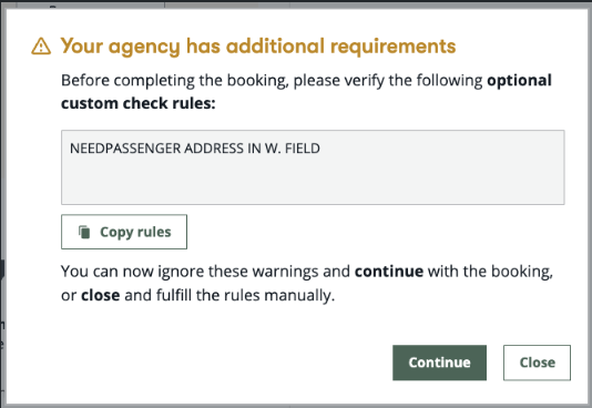 Agencies often apply Custom Check Rules (CCRs) at the PCC level to enforce business policies or ensure data completeness in bookings. Historically, these rules were enforced only via the terminal flow, and the agent must comply with them according to the agency's instructions (For more information, search for Custom Check Rules in MyTravelport).