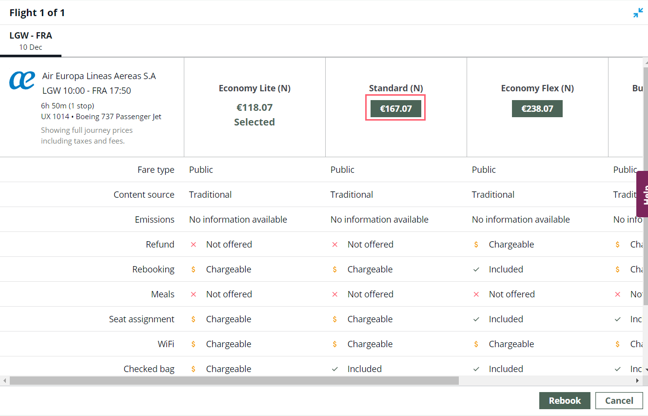 The available brands display. To select a different brand, select the price button for that brand. It is recommended to select the same brand for all flights, as mixed brands do not always combine.