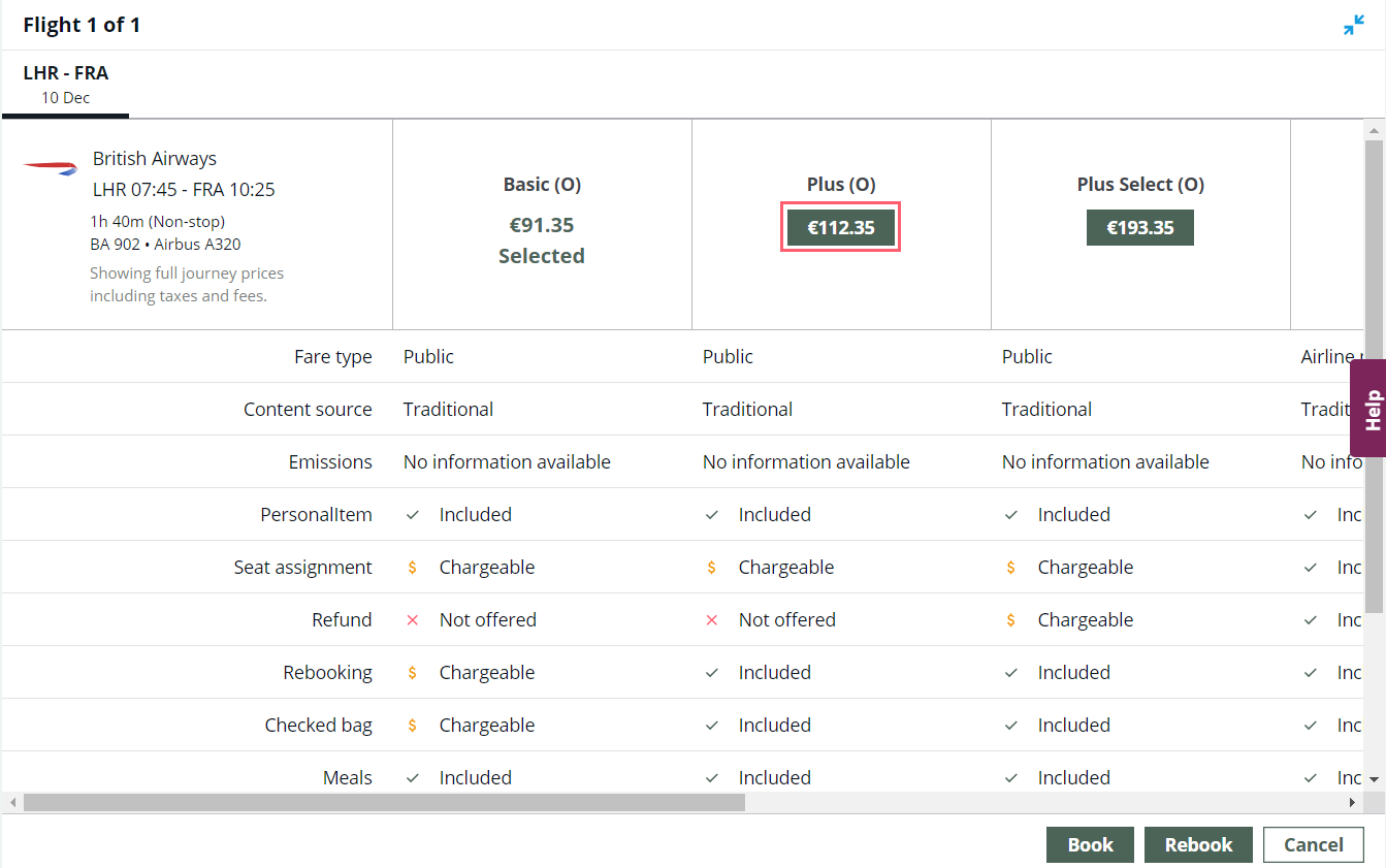 If a flight option with a lower fare is found, a Rebook link displays for your existing flight option, as well as a message Lower fare available.