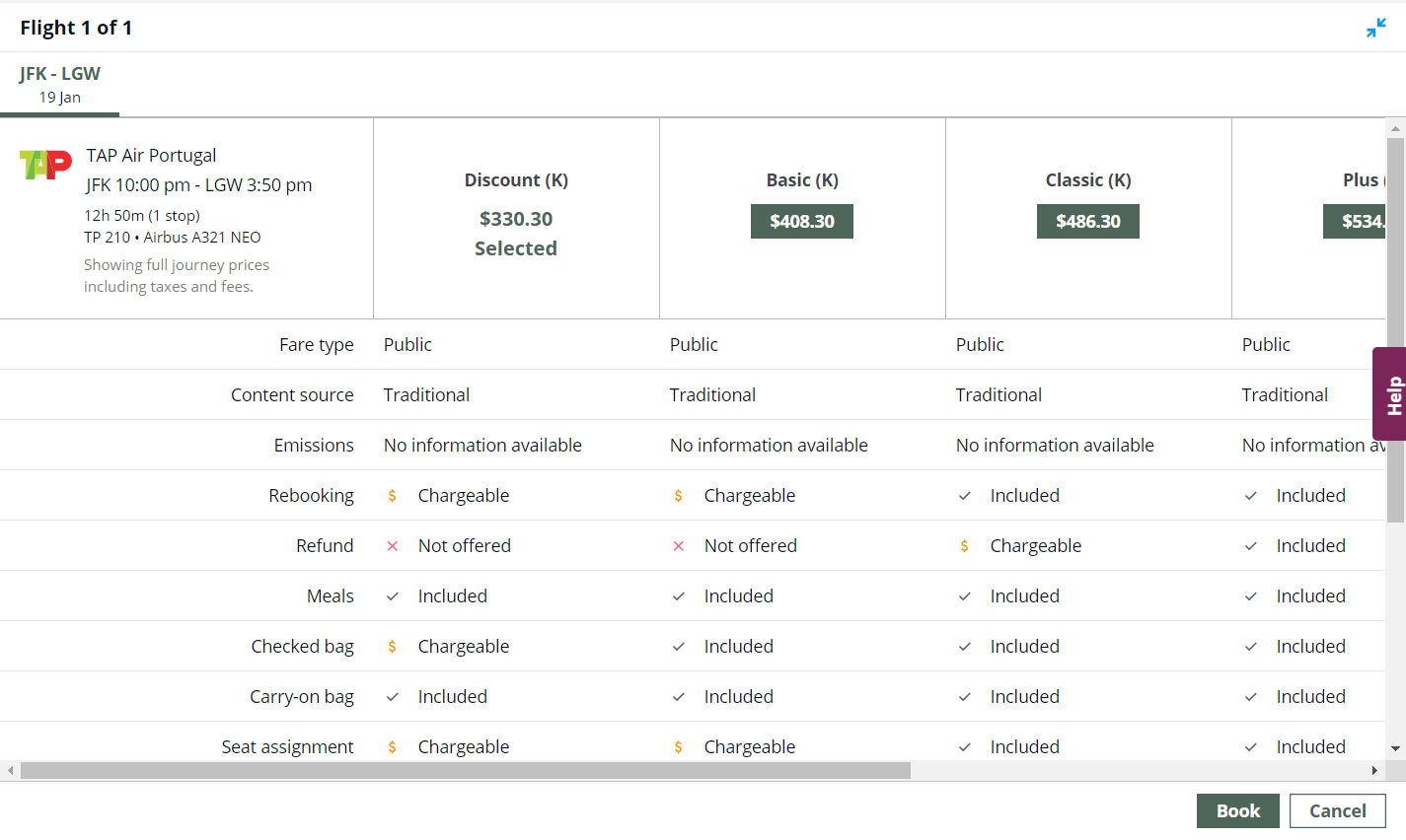 Select D to display the flight option details, including total journey time and fare details. You can view details for multiple flight options in order to compare them.