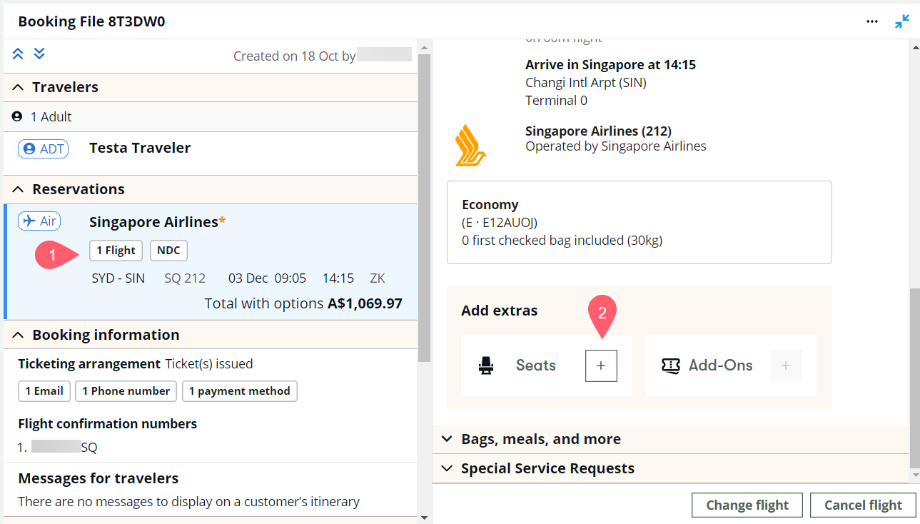 • If you are adding seats after ticketing, select the Reservation section, then scroll down on the right panel to the Add extras section under the itinerary information and select the + icon.