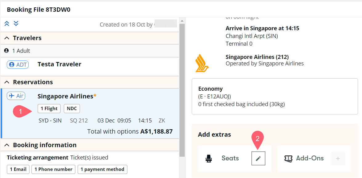 2. Select the Reservation section, then scroll down on the right panel to the Add extras section under the itinerary information and select the edit seat icon.