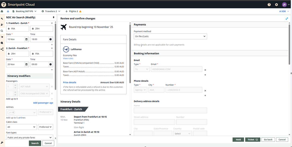 3. The NDC Air Search (Modify) panel on the left is pre-populated with the current flights. Change the date/time for the undesired flight to something more suitable.