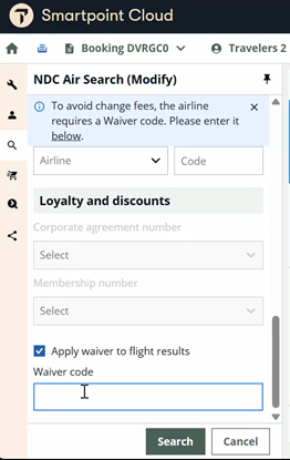 Certain airlines may require the user to enter a waiver code to have the penalties waived. If this is the case, the Apply waiver to flight results check box is automatically selected and the user enters the waiver code in the text box.