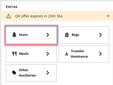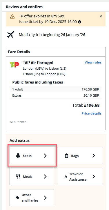 • If you are adding seats before ticketing, on the Review and confirm panel, scroll down to the Add extras section under the Fare Details and select the + icon to add seats.