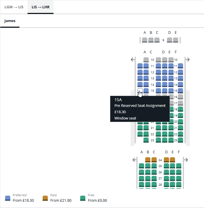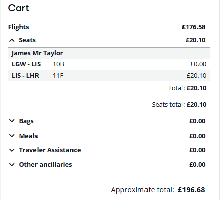 Seat selection and cost displays for each passenger.