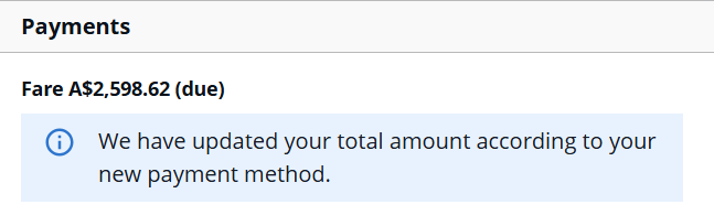 Note: If during ticketing a change is made to the FOP of a held booking, the system performs a background reprice to ensure the OB-Fee reflects the correct payment method. A blue informational banner on the payment component notifies agents of the updated fee.