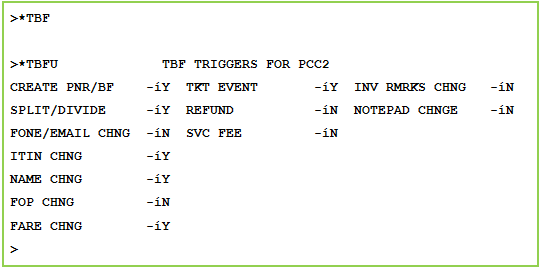 Access to modify TBF Triggers is a PCC set by Travelport in the AAT, which governs functional capabilities for each PCC. The TBFA (Travelport Booking Feed Activation) field (formerly the GIDS field) has two flags: